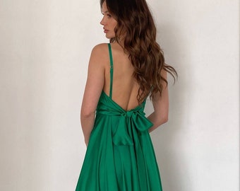Green Silk Midi Dress Deep V Neck Open Back Belt Bow Fitted Etsy